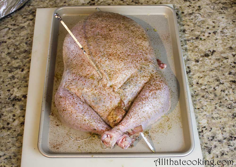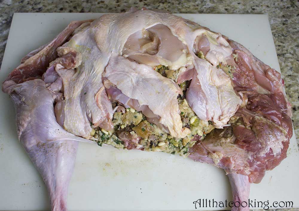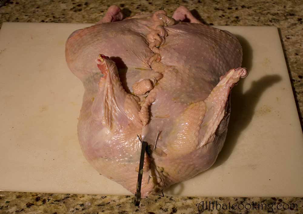 8. Carefully turn the turducken right side up. Seal the gap with another pin and tie the legs together.