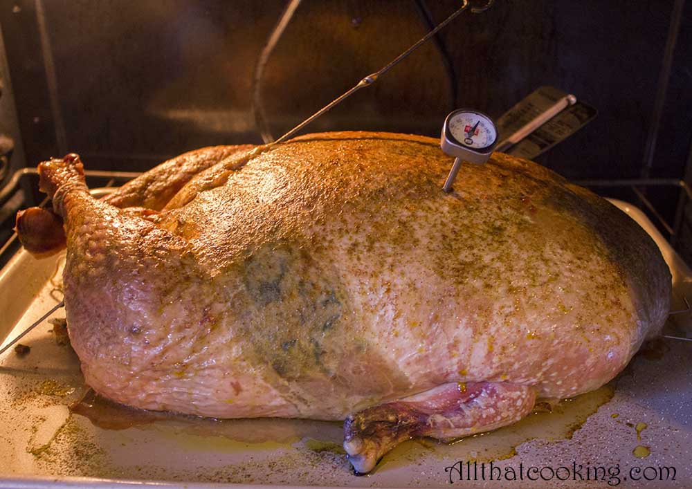 9. Bake at 200F for 9 hours. During the last 30 minutes of baking increase the oven temperature to 350 F. Make sure you have a meat thermometer in the center of the turducken. The turducken is done when the temperature reads 170 F.