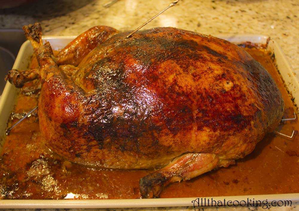Serve with mashed potatoes, gravy, mashed and sweetened sweet potatoes topped with marshmallows, salad, and Gina’s sweet cranberry thing.