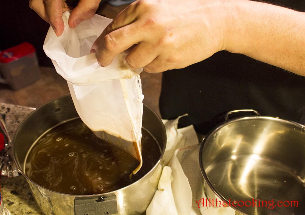 Straining glögg through a plastic filter bag we bought at the brewing and wine making supply store.  You can also use a very fine cloth.