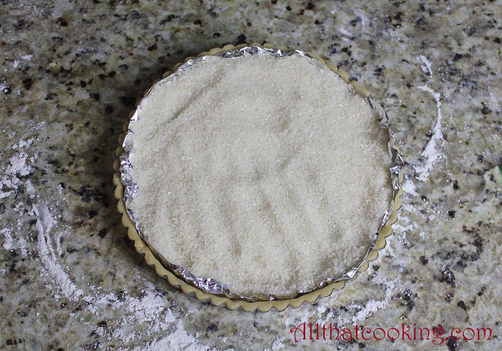 9. Now you are going to “blind bake” the crust.  Blind baking keeps the crust from getting soggy when you add the filling.  Fill the lined pan with dried beans or rice. The weight keeps the crust from bubbling up when baking.