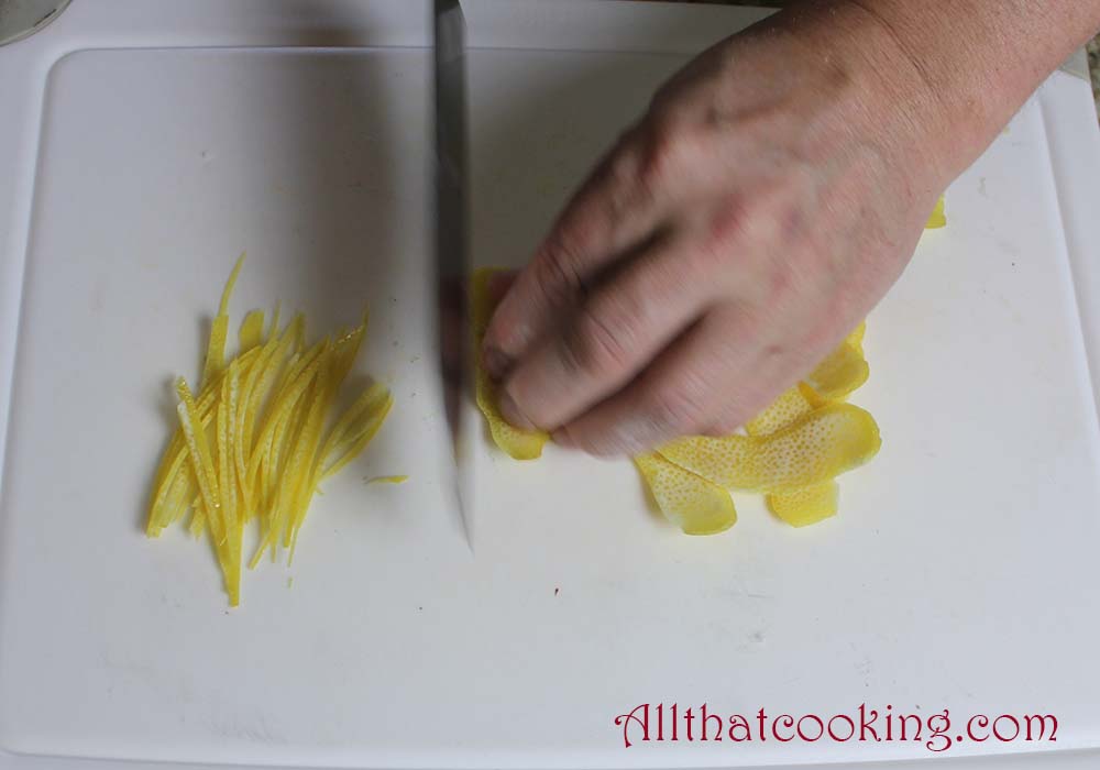 1.  Use a sharp knife or vegetable peeler to remove rind from lemons.  Be sure to cut away all of the white pith from the slices.