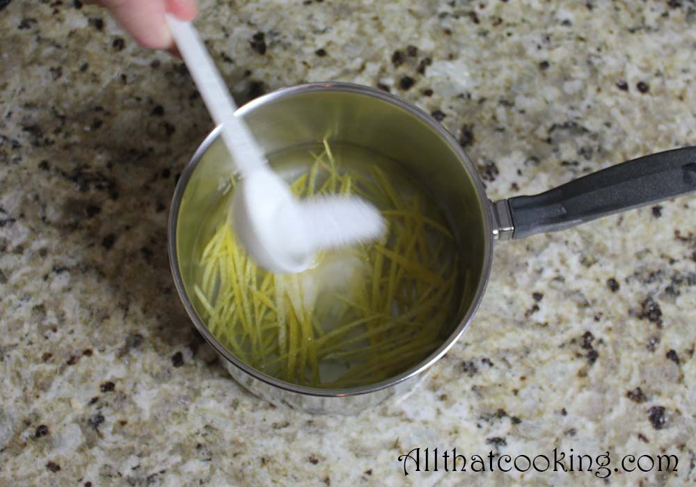 3. Place peel, and 2 cups of water in a small sauce pan and bring to boil.  Boil for 5 minutes, remove from heat and drain.