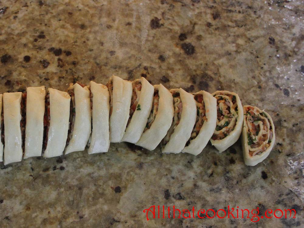 3.  Roll pastry dough jelly roll style until you have a long roll.  Do not roll too tightly.