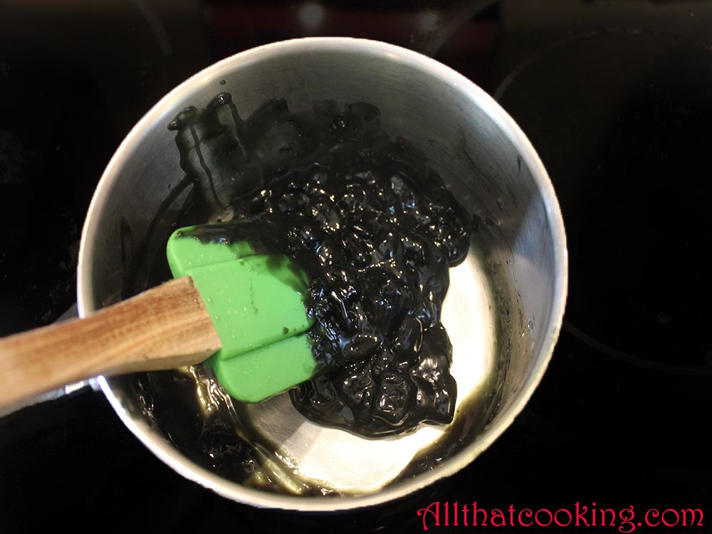 1. In a small sauce pan combine licorice, sugar and water. Bring to a boil then cover and simmer until licorice is melted and water is mostly evaporated. Stir often so that licorice does not burn. You will have a thick paste.