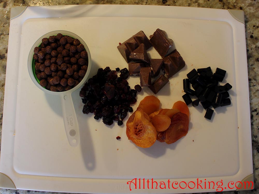 3. In a large bowl mix together Coco Puffs, licorice, Toblerone, berry blend, apricots and peaches. Refrigerate until ready to use.