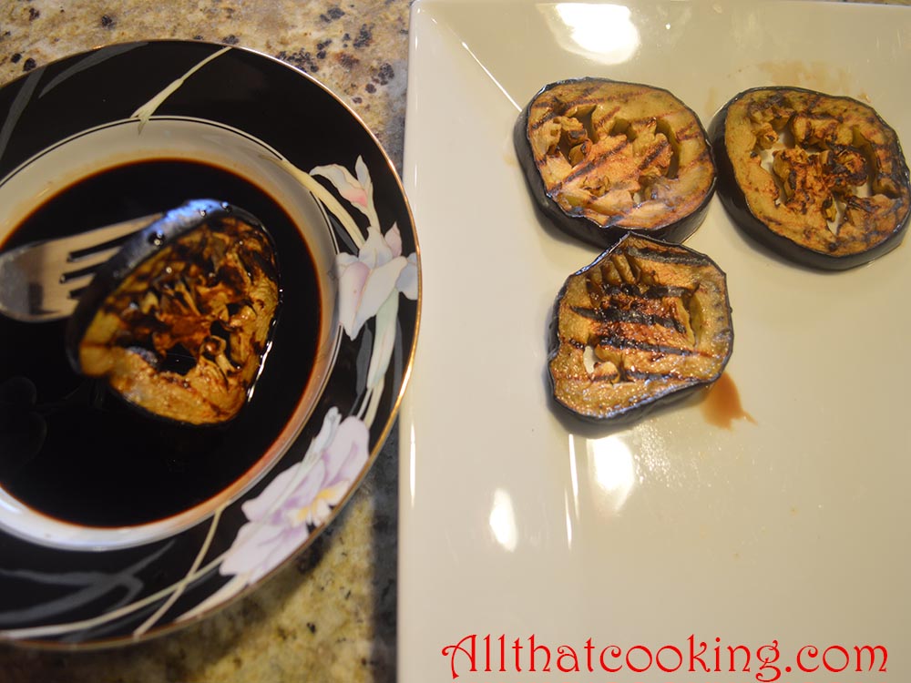 It’s a good idea to get organized before you start to grill.  Pour some balsamic into a shallow bowl and place next to the grill.  Place a serving platter or large plate next to this, so that you can take the eggplant from the grill, dip them into the balsamic then place them on the serving platter.
