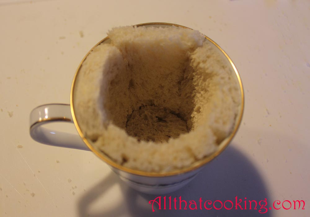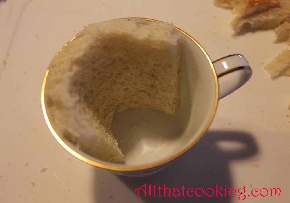 1.Cut bread into 4 circles that will fit into the bottom of each cup. Cut remaining bread into strips of a size that will fit the sides of the cup.
