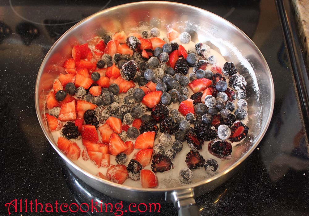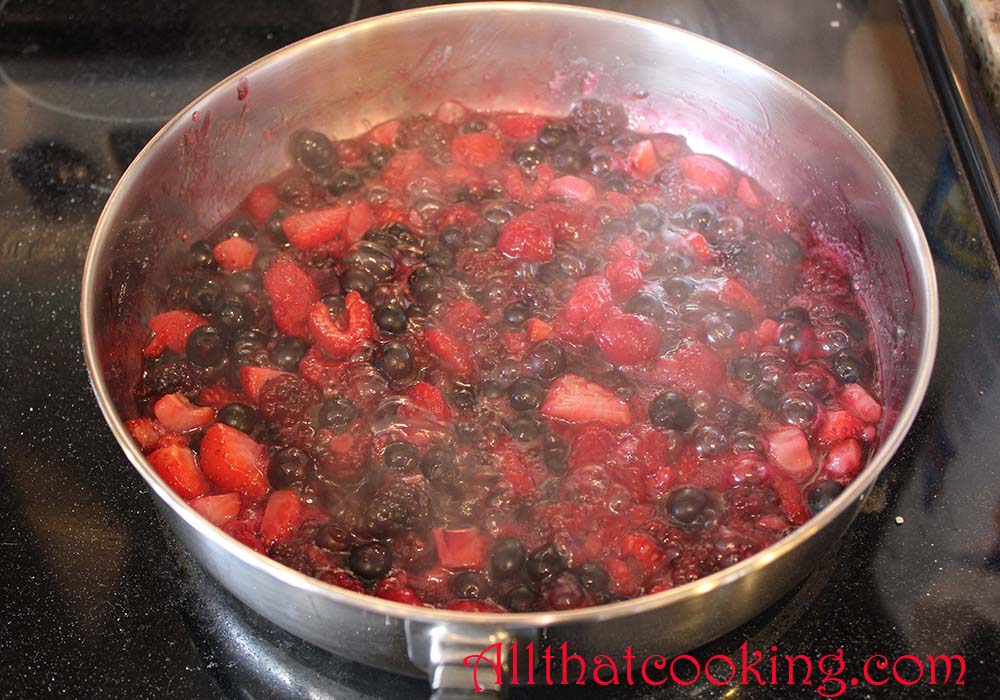 1. Place berries, sugar and water in a large skillet and bring to a boil over high heat. Gently mix to blend. Cook for about a minute – not longer. You should have a lot of sauce and the berries should remain firm and keep their shape.