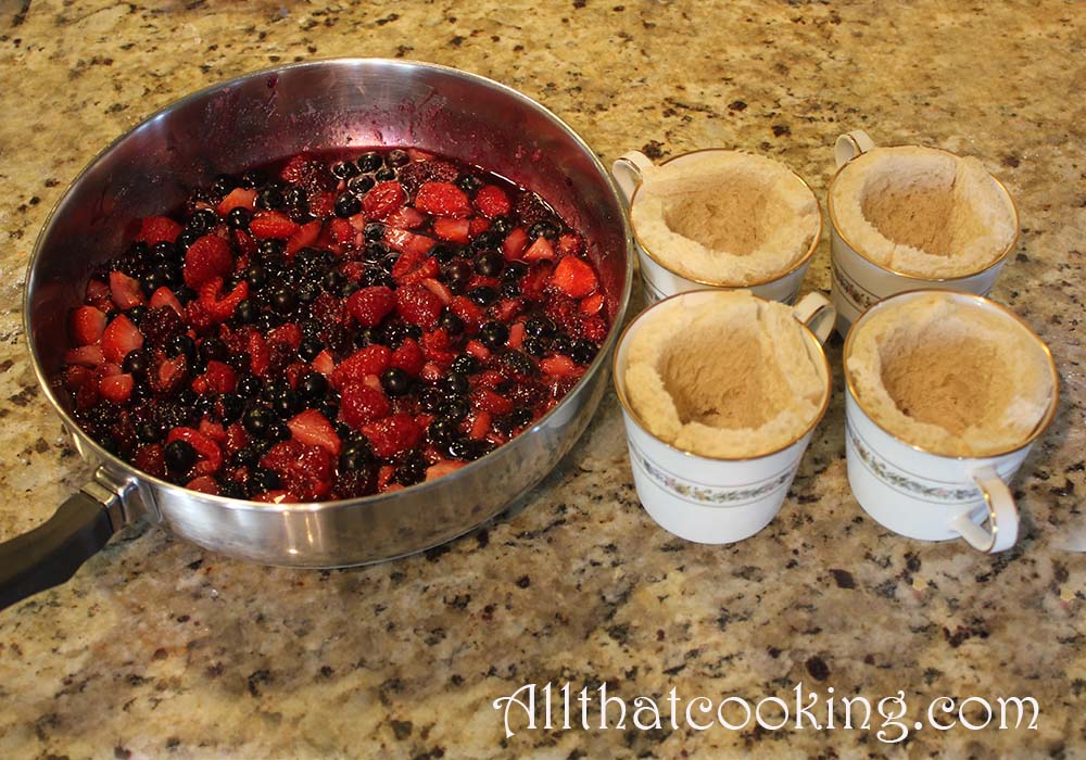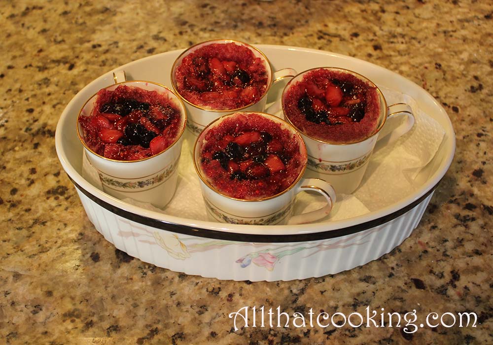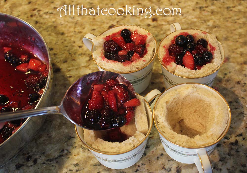 1. Fill each bread lined cup to the top with berries and sauce. Don’t be afraid to use a lot of sauce, as the bread will soak it up overnight. Refrigerate remaining berries and sauce until serving.