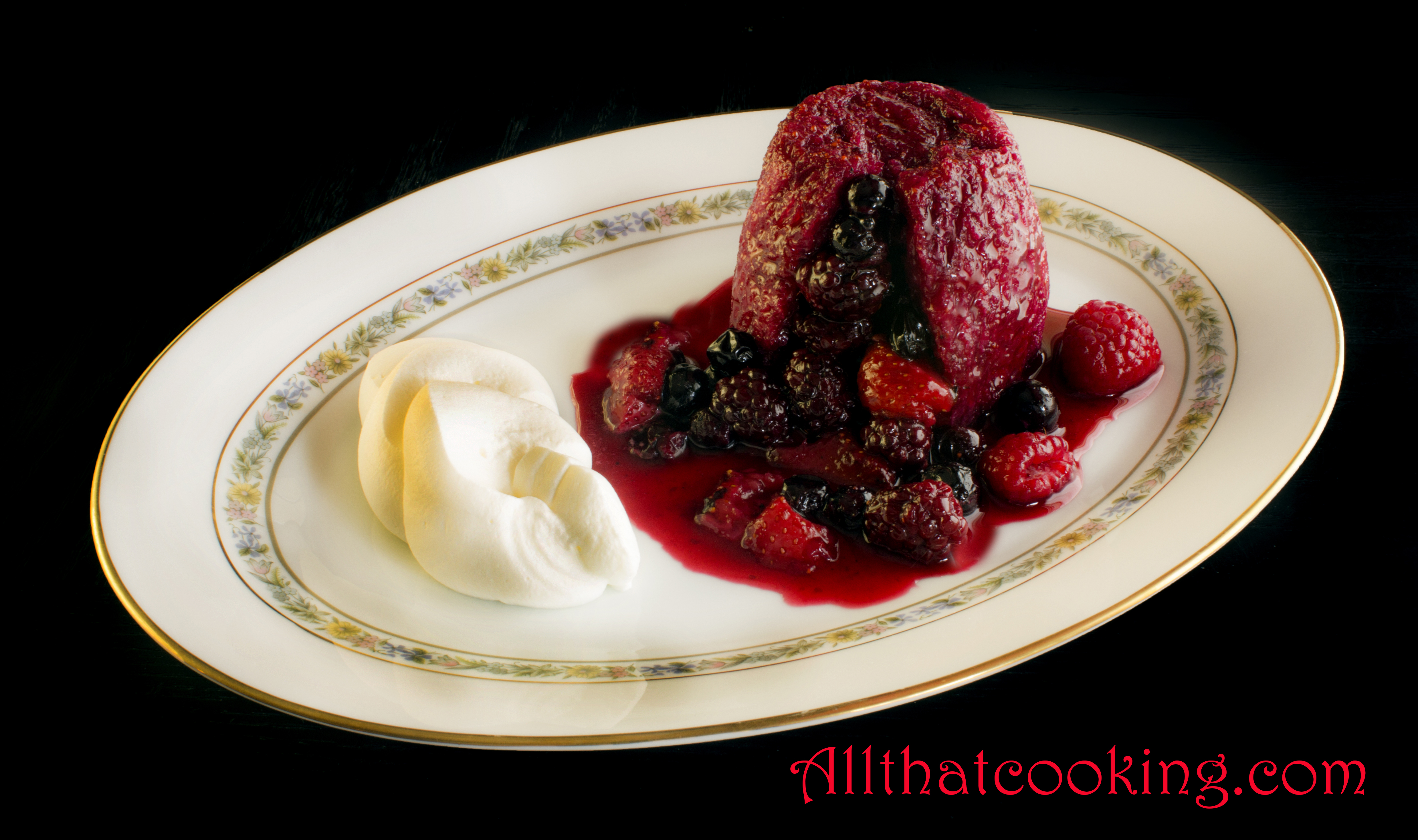 5. Spoon remaining berries and sauce onto plate and serve with whipped cream.
