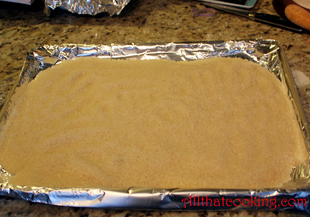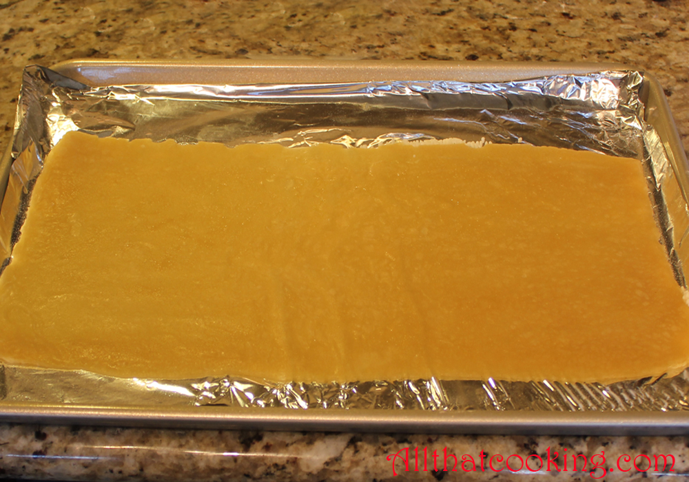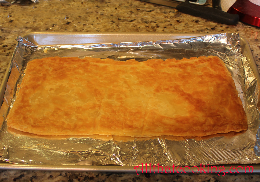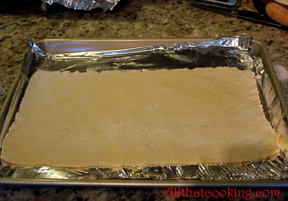 1.  On a lightly floured surface, roll out dough to about 10-inches by 16-inches  1/8-inch thickness – it should fit nicely onto a cookie sheet.  Use a fork to prick the entire sheet at about 2 inch intervals.