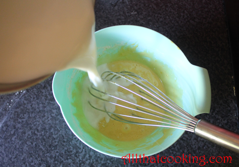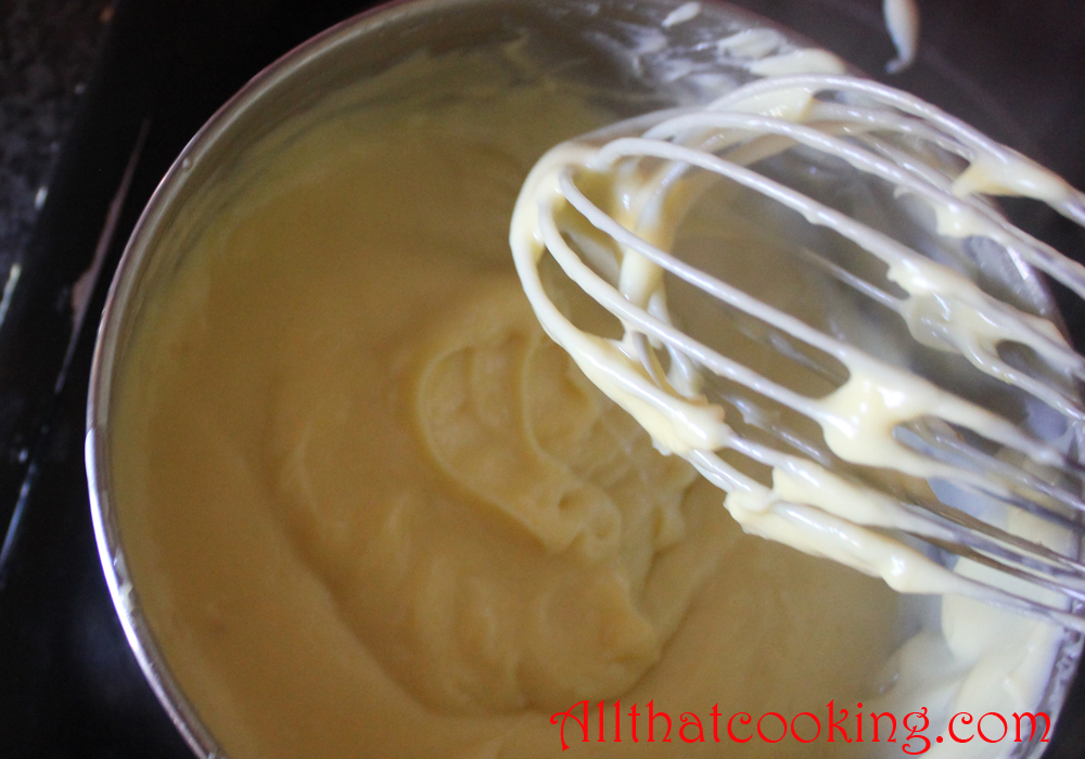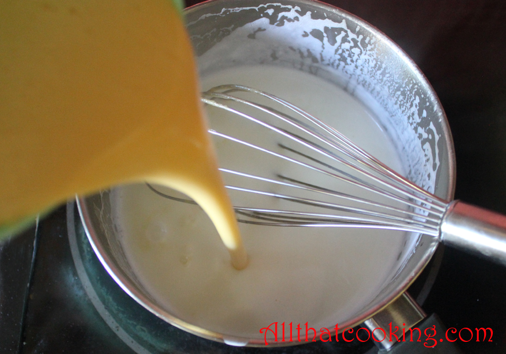5.  Whisk egg/milk mixture from the bowl into the milk in the pot.  Bring to boil and let cook carefully for 2 minutes while constantly whisking.