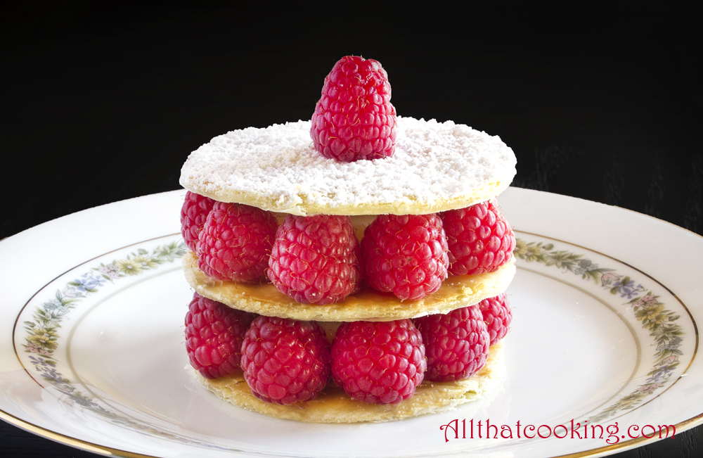 Mon dieu, what a dessert!  Melt in your mouth pastry with a buttery crunch, smooth and velvety vanilla custard and sweet/tart raspberries.  Only the French could come up with this perfect contrast in textures and flavors.