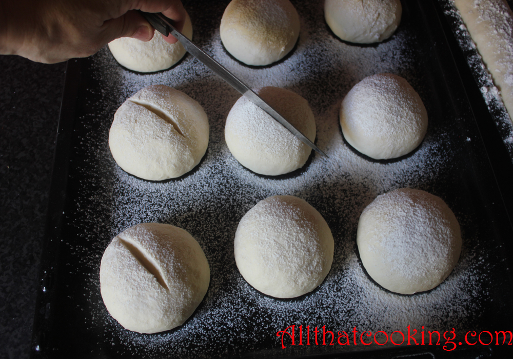 4.  Lightly sprinkle tops with flour and use a sharp knife to score the tops.