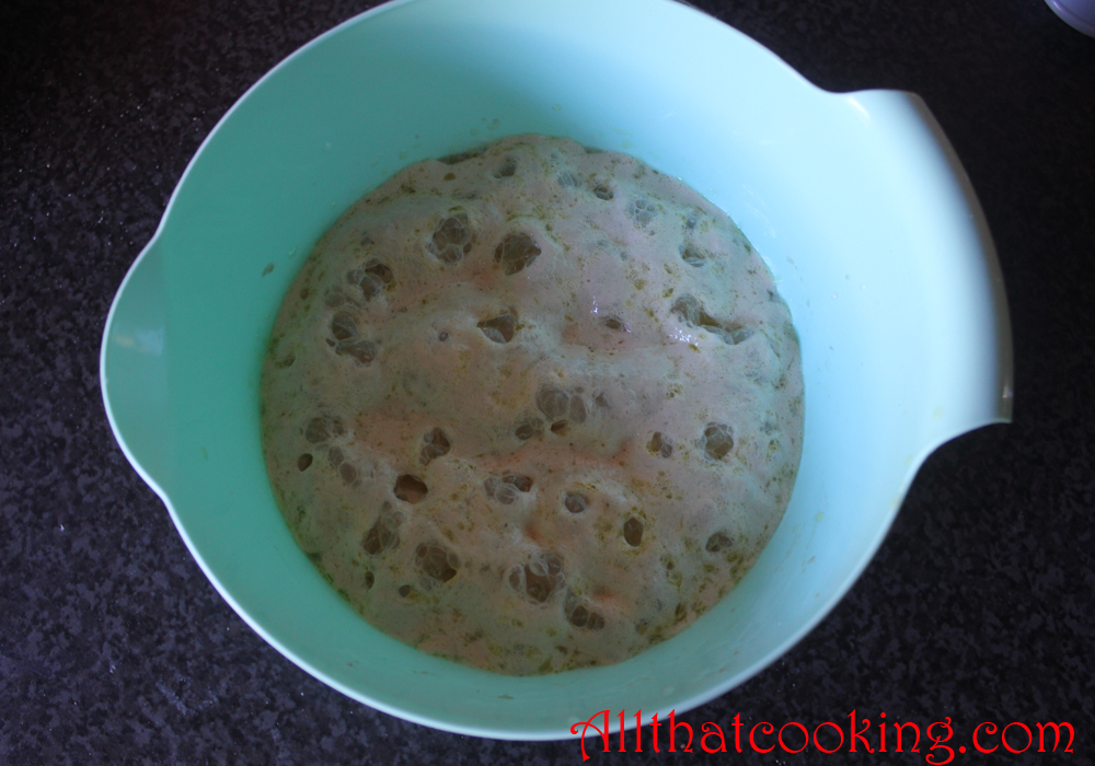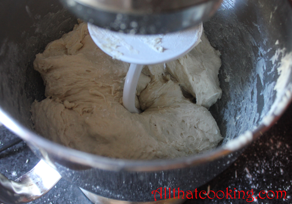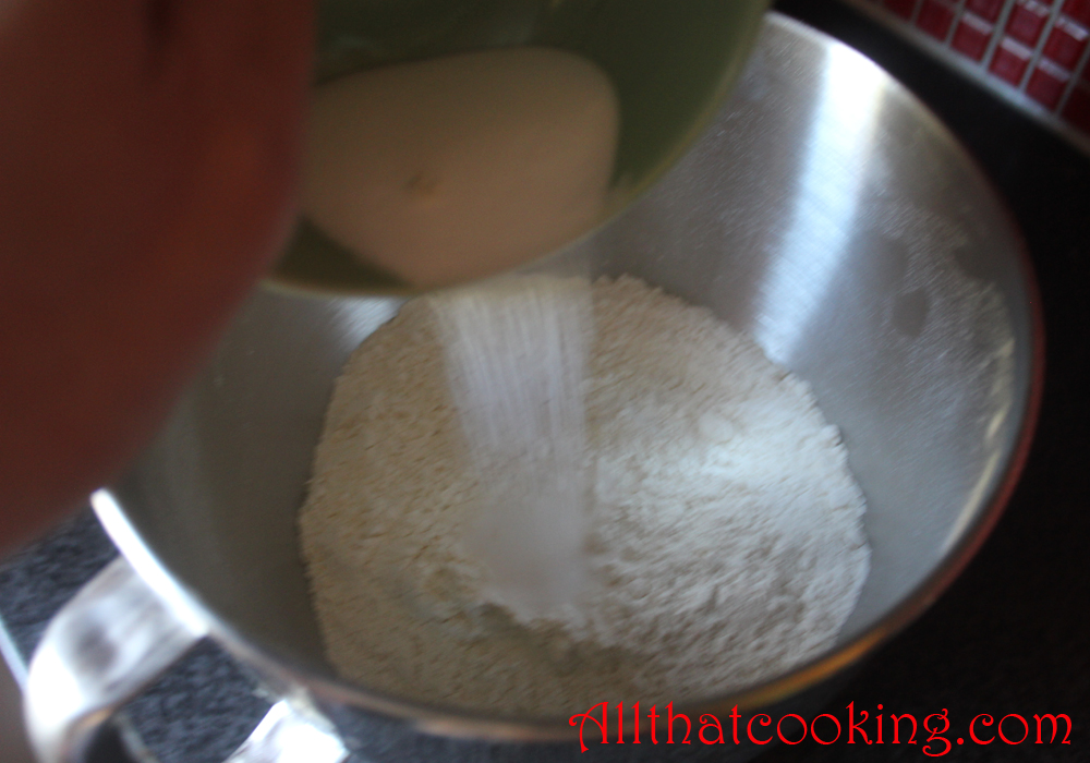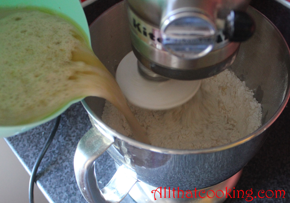 3.  Pour yeast mixture into flour, set the mixer to slow speed and mix for about 5 minutes or until dough is smooth and elastic. Scrape flour from sides of bowl as necessary. You should have a dough that is almost sticks to your hand when touched and comes away from the sides of the bowl.