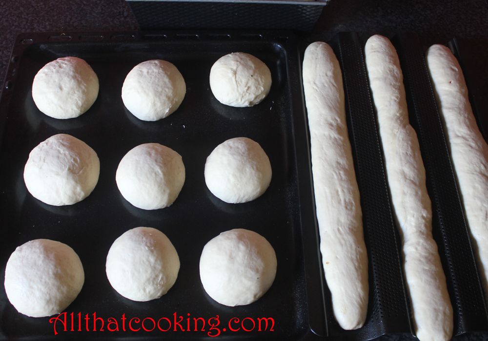 2.  Knead each one for a few seconds and shape into rolls or place in lightly greased baguette pans.  Don’t knead to hard because the dough will become too elastic and if you are making baguettes the dough will be difficult to roll.