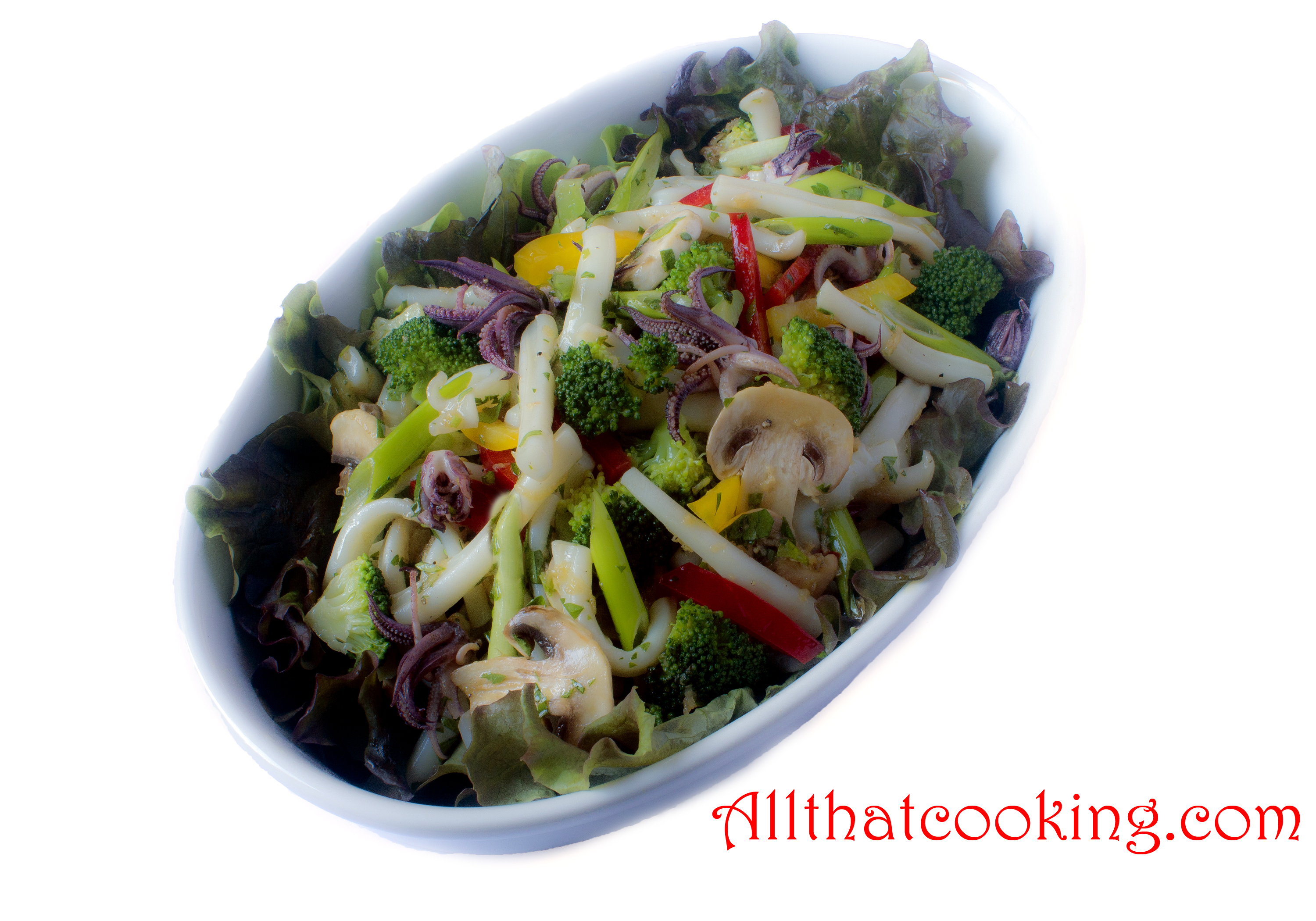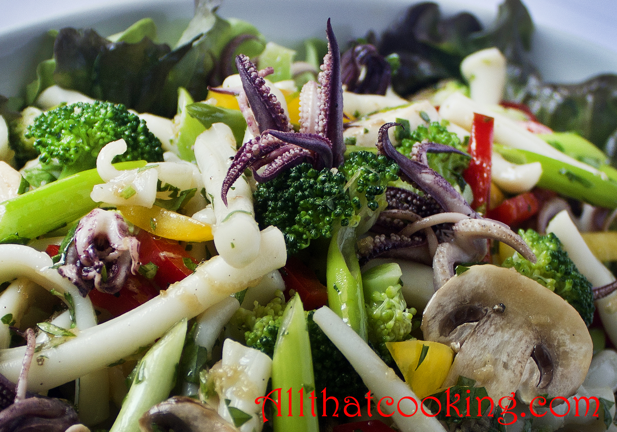 5.  Give the dressing a quick whisk or two, dress the salad and toss gently. Squid salad