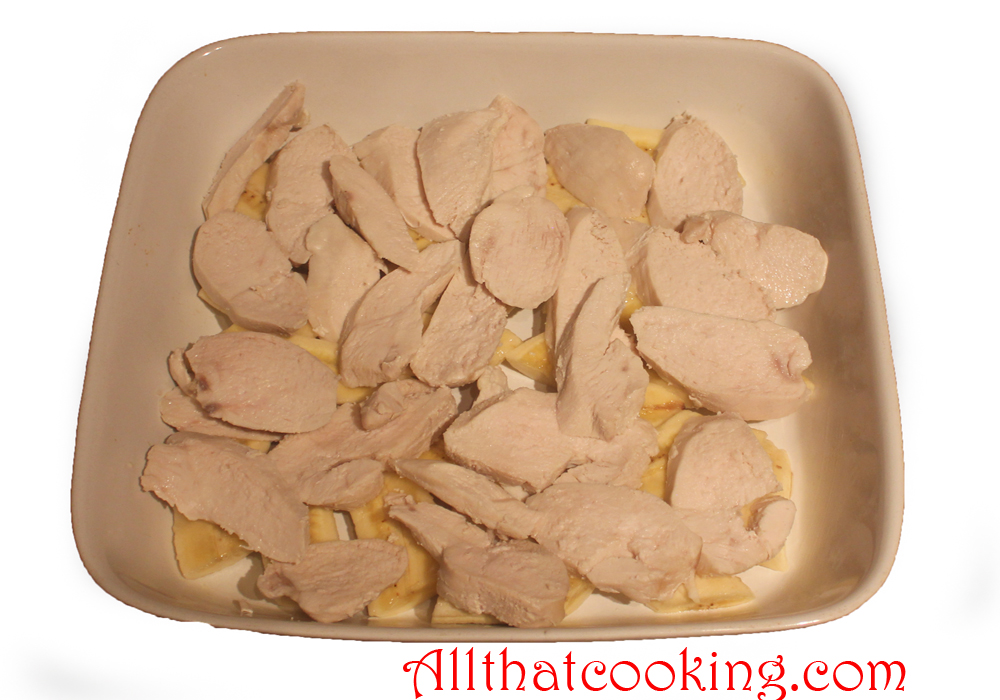 2. Grease an ovenproof dish with butter. Cover bottom with bananas then top with chicken.
