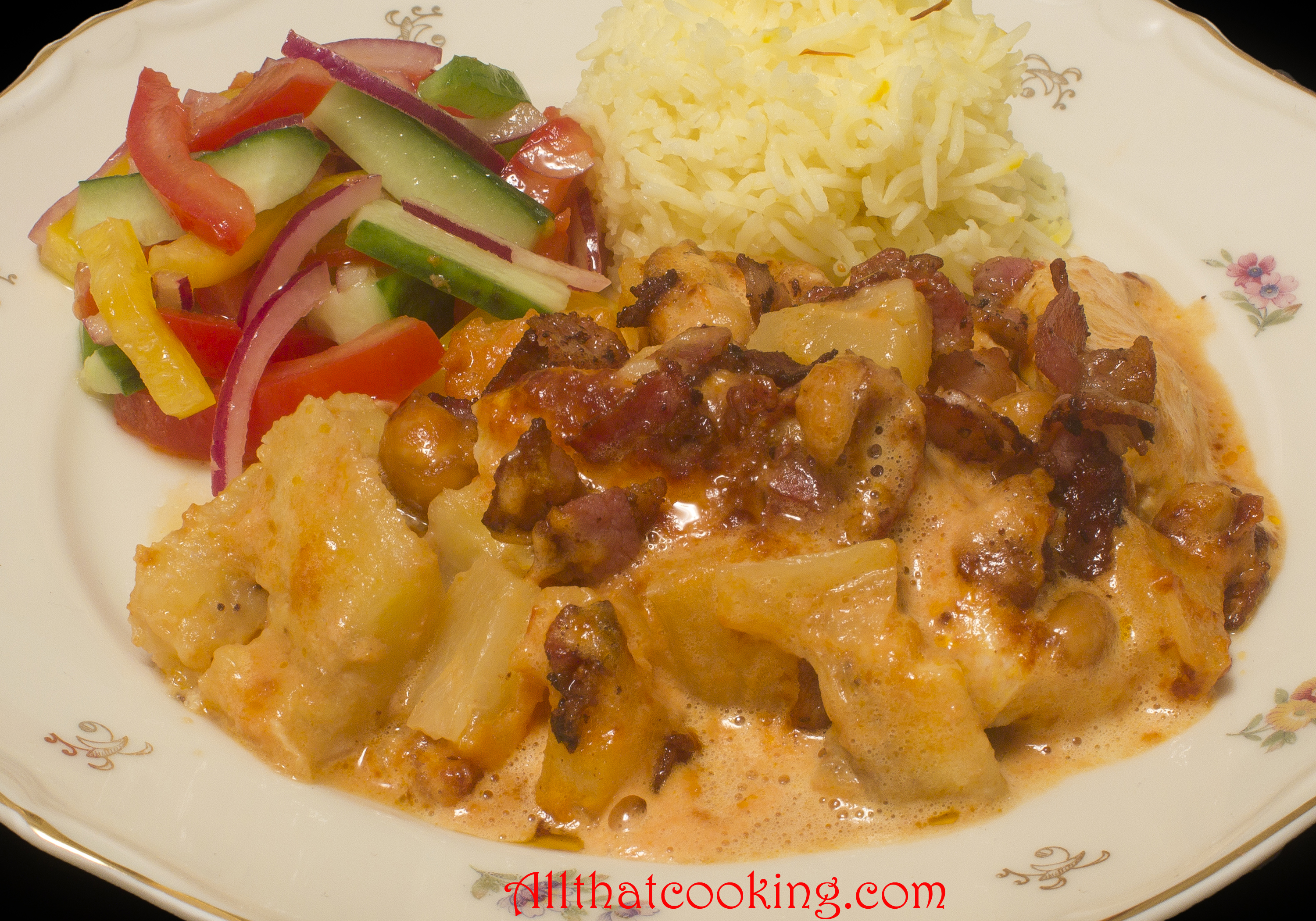 Anyway, this strangely unique dish is pretty darn tasty! Layers of cooked chicken, sweet bananas, crunchy peanuts, slathered in a creamy, slightly tangy chili sauce, finished off with smoky bacon crumbles (everyone knows bacon makes anything taste better). . . The only thing missing for Oli was something to add a clean freshness. That’s where the pineapple comes in. This touch of the tropics lends a sweet, slight citrus sharpness that simply brings the whole dish together.