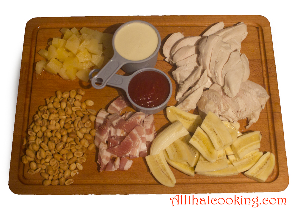 Question: What do you get when you combine chicken, bananas, peanuts, whipping cream, chili sauce and bacon?