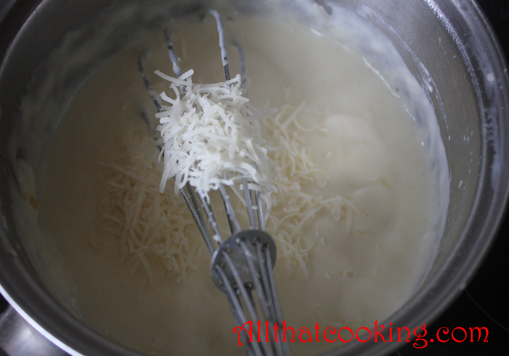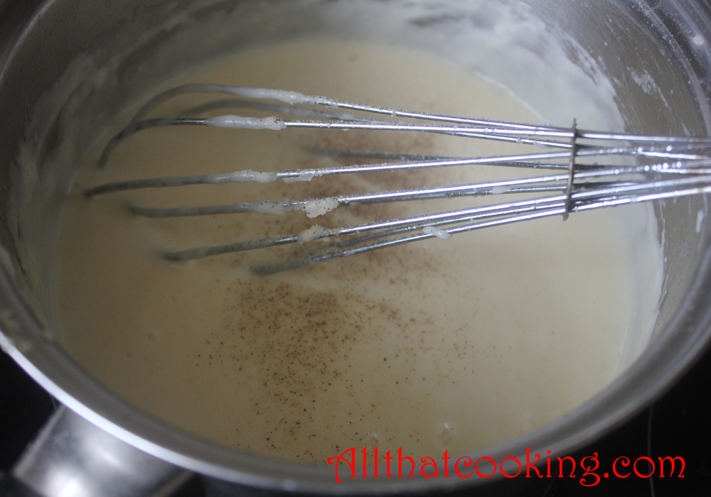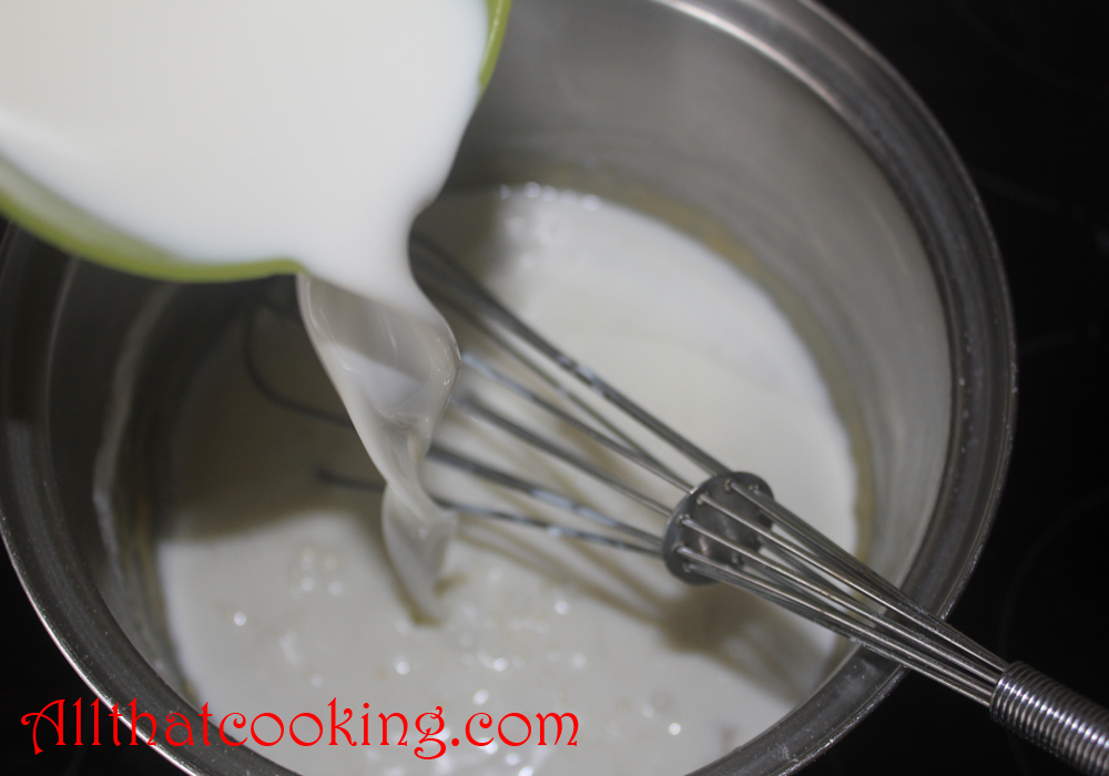 Pour in milk and bring to a boil, whisking continually. When boiling reduce heat to medium high and cook for 2 minutes. Whisk continually.
