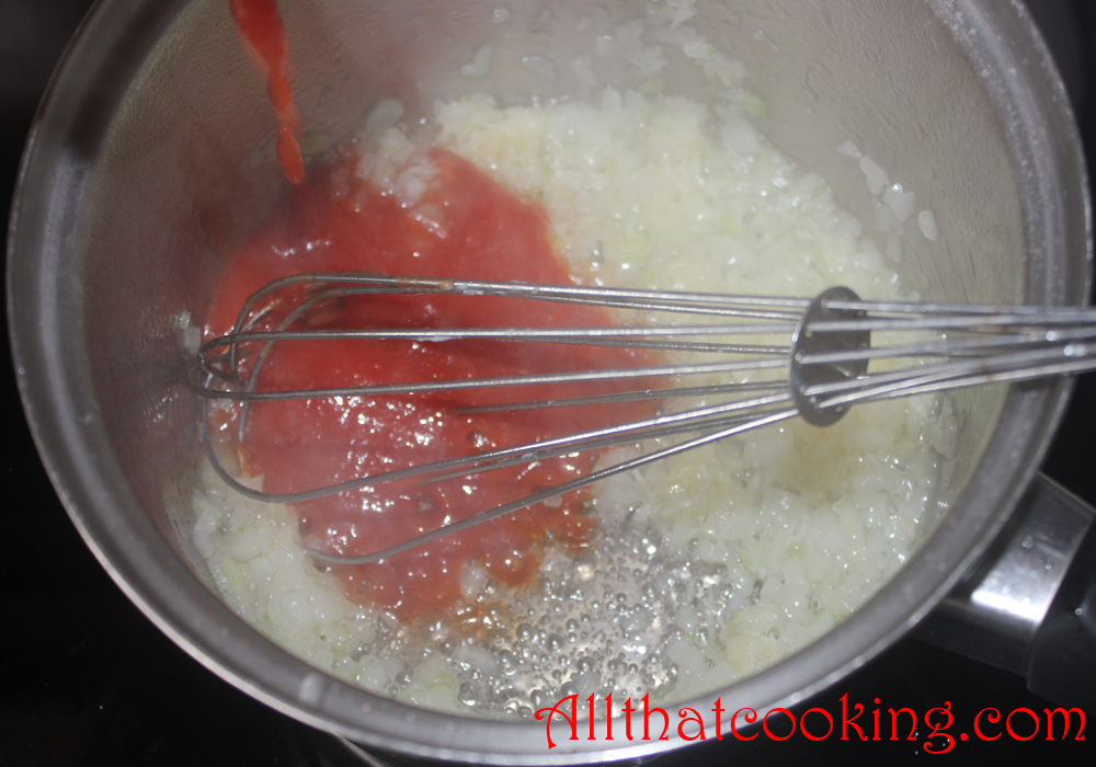 Gently whisk in garlic, tomato sauce and salt. Bring to a boil and simmer slowly for a minute.