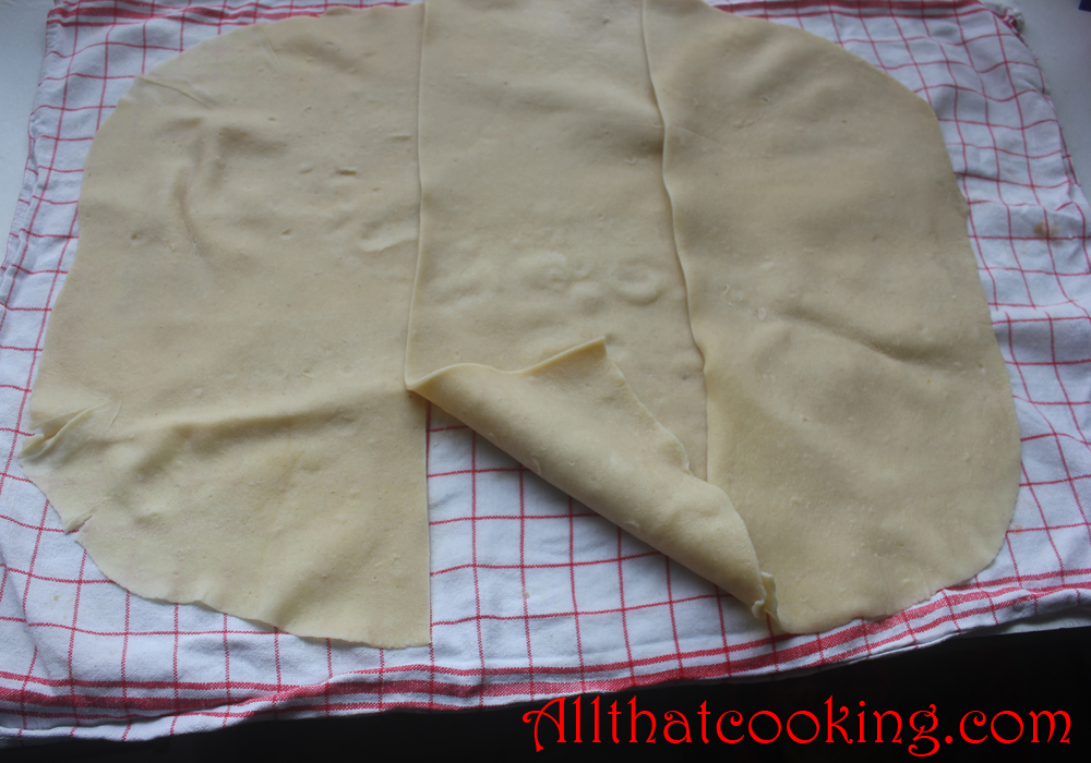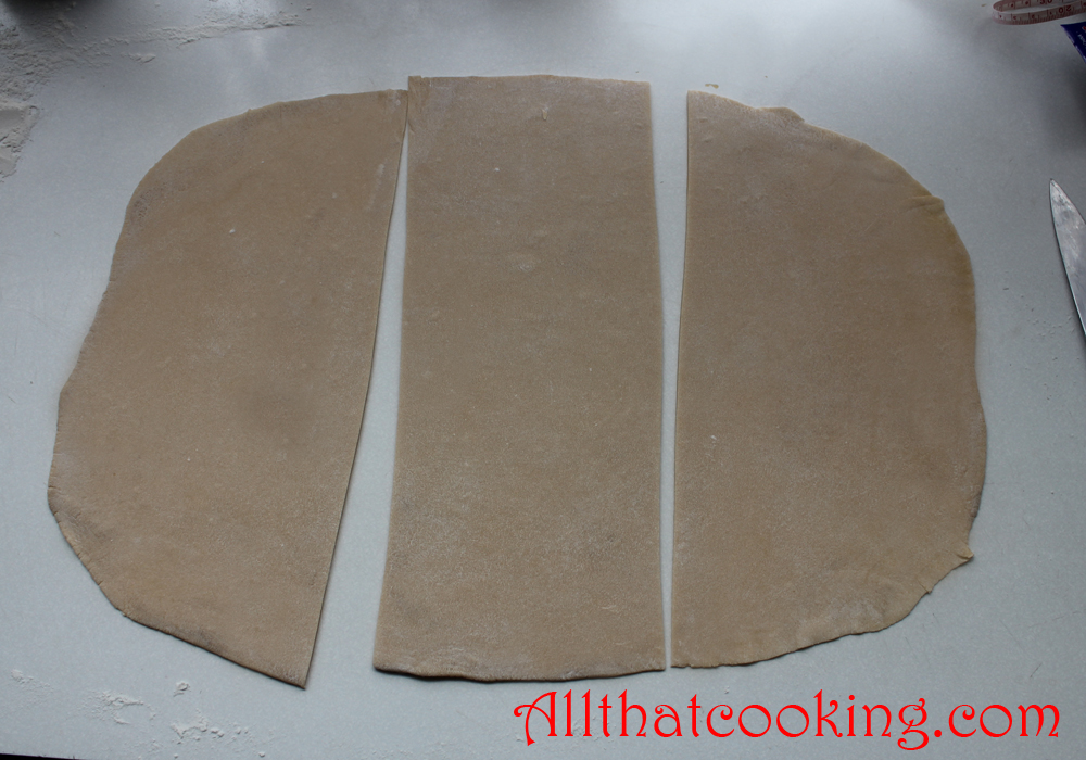 1. Place pasta dough on a clean, flat surface that has been lightly dusted with flour. Use a rolling pin to flatten dough, and roll it out to a very thin 12×18-inch rectangle.