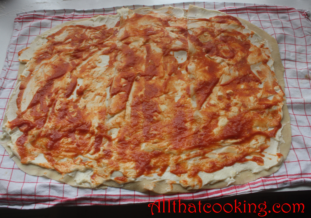 3. When pasta has cooled, evenly cover it with 1/2 of the cheese sauce then all of the tomato sauce.