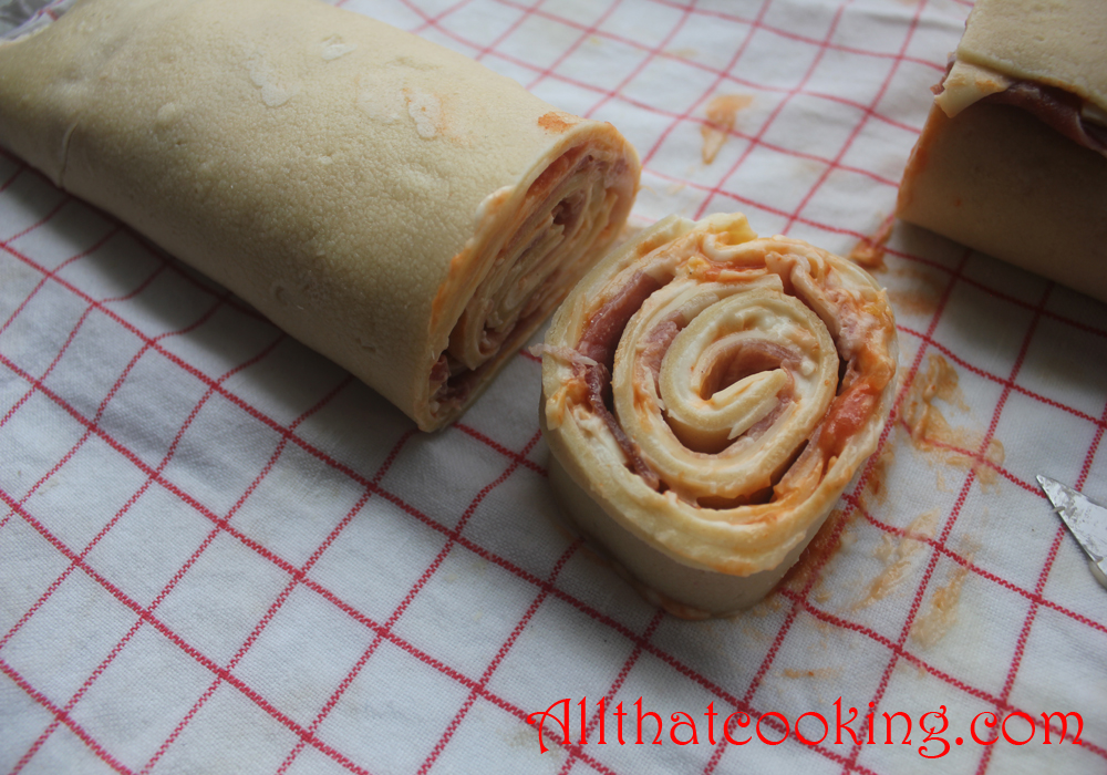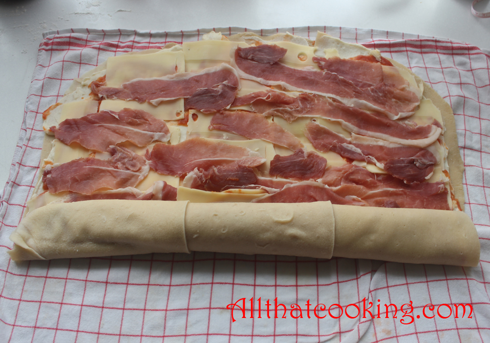 5. Roll this masterpiece lengthwise as tightly as you can. It will look like a long jelly roll.