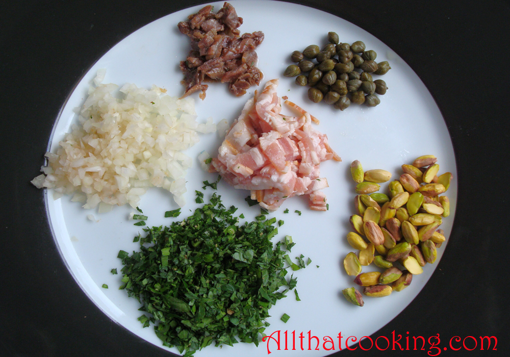 5.  Strew in capers, pistachios, anchovies and parsley.