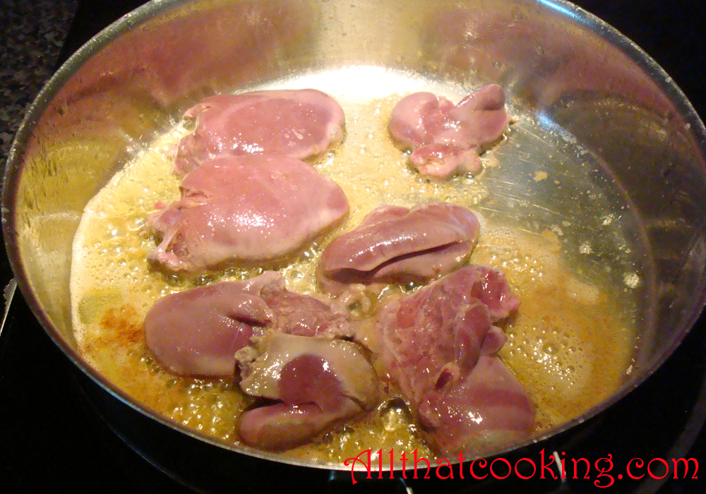 3.  When sizzling, decrease heat to medium high and drop in livers. When they begin to sweat after about three minutes turn them over.