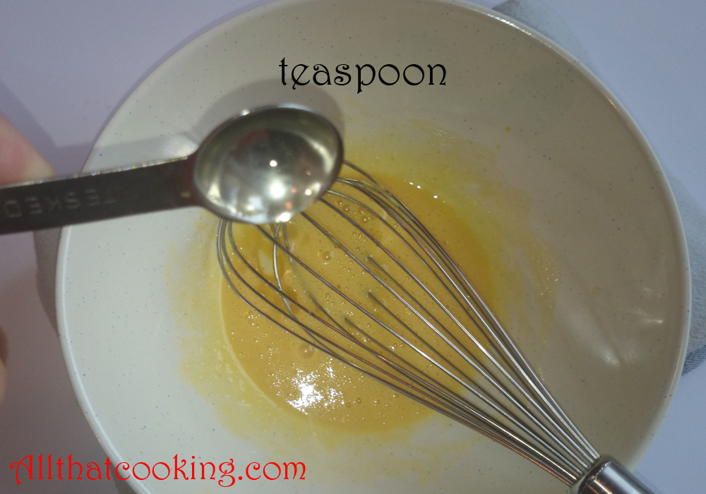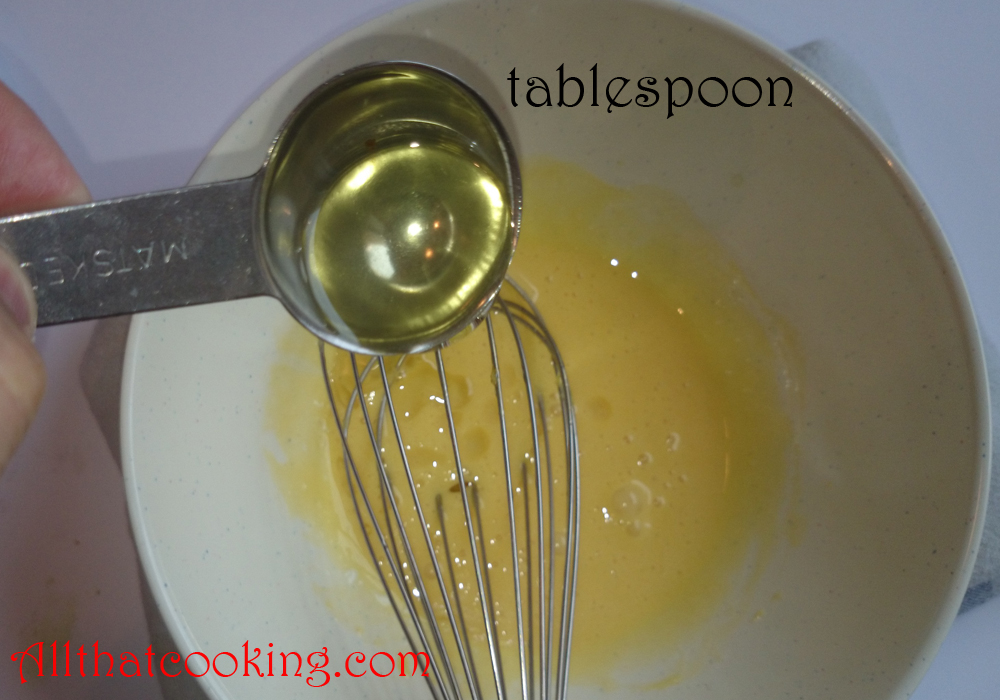 3. While whisking constantly, pour in 1 teaspoon oil and count to ten. Repeat this with the first 10 teaspoons.