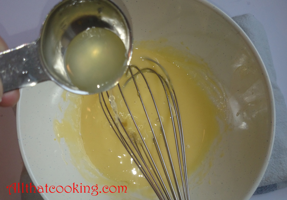 4. Now start adding a tablespoon at a time and count to ten between additions. Whisk until 1/2 cup of the oil is incorporated. Now whisk in the lemon juice.