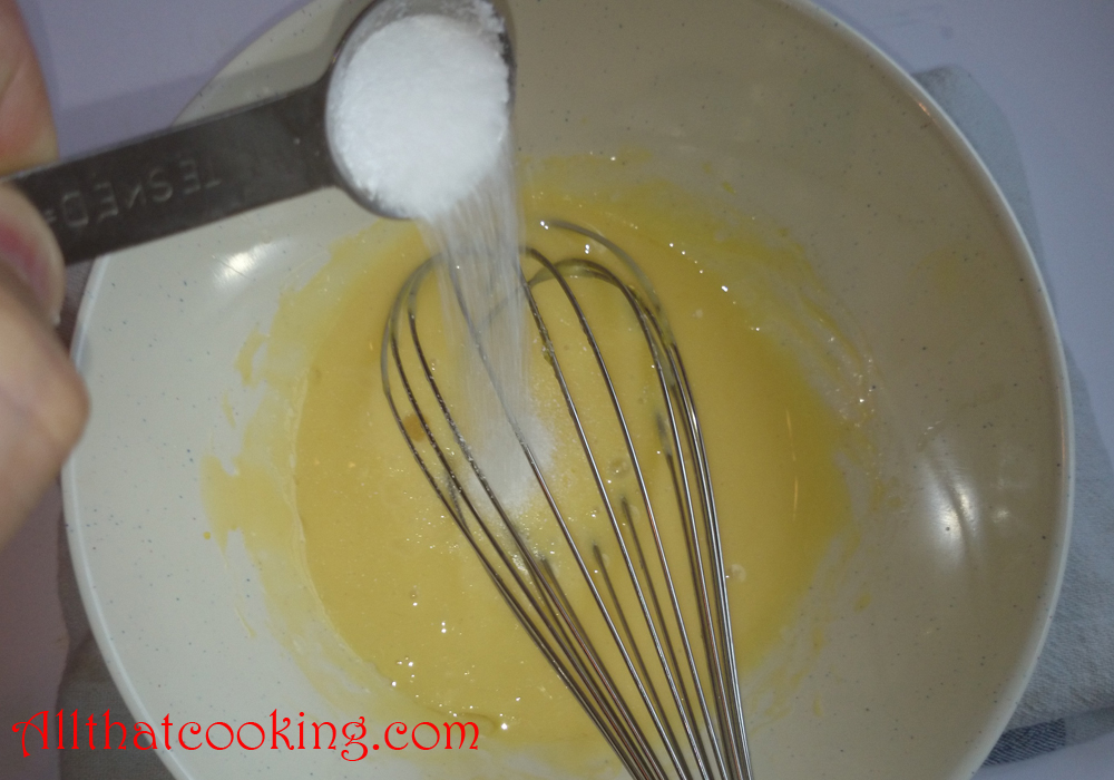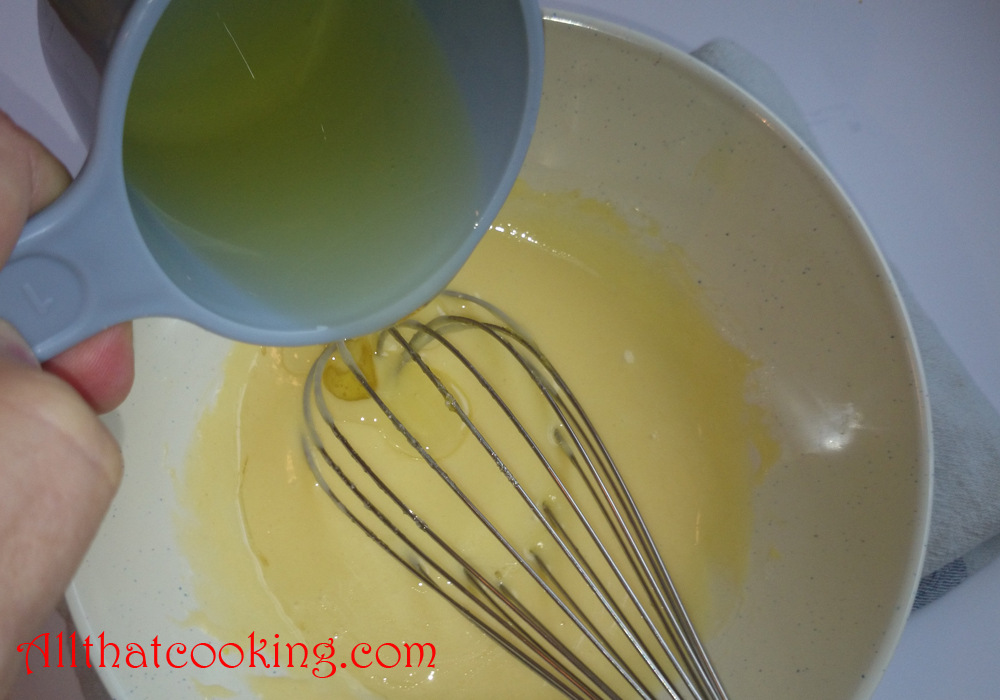 5. Add the salt and continue whisking. Gradually whisk in the remaining oil (here you can pour the oil in a slow stream or a little at the time) until all of the oil is incorporated.