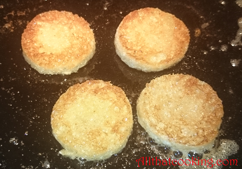 2.  Heat butter and oil in a medium size skillet over medium high heat.  Add bread rounds and quickly cook on each side until golden.  Remove from skillet and pat dry on paper towel.