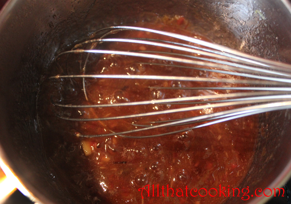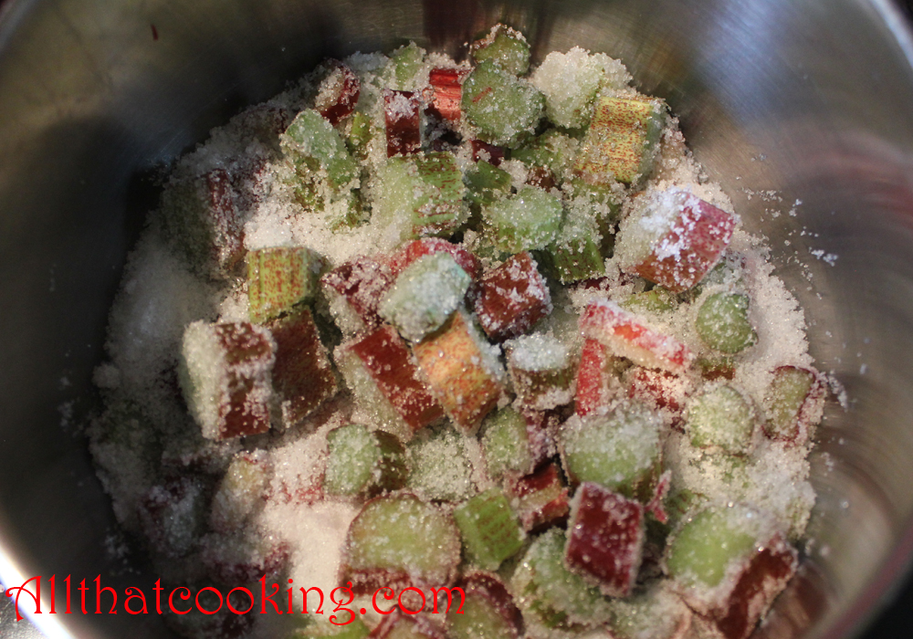 1. In a medium size sauce pan, bring sugar and rhubarb to a boil over medium high heat. Cook, stirring occasional until rhubarb falls apart and is pureed.