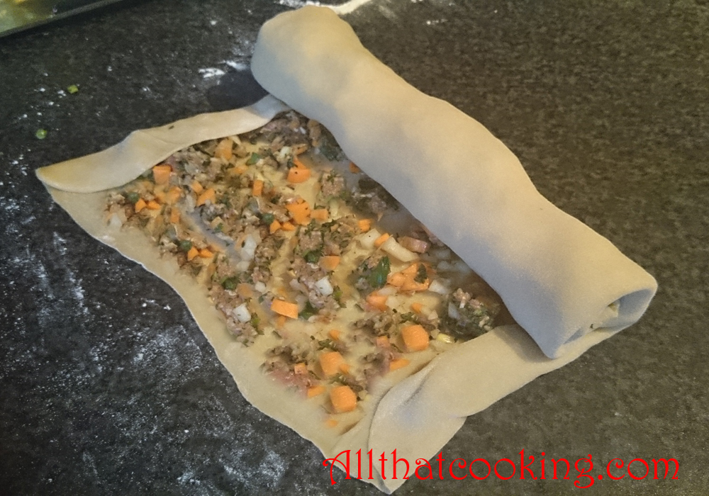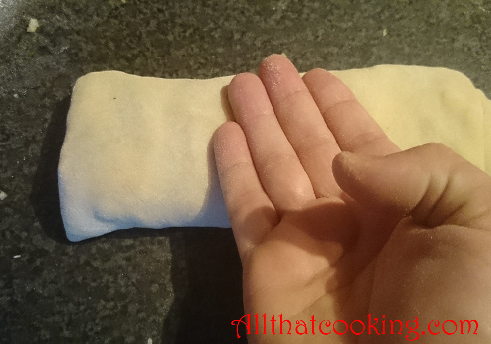 3. Divide the filling onto each pasta sheet and evenly spread it leaving about a one inch margin on each of the longer sides. Fold those sides in and begin rolling the dough (jelly roll fashion) from the shorter end.