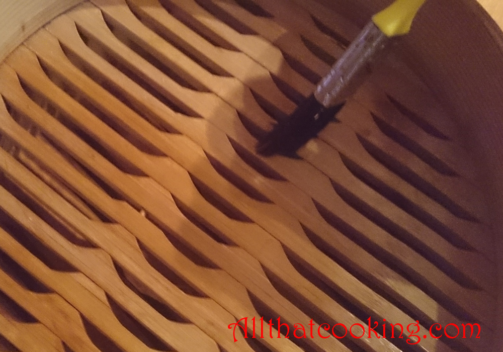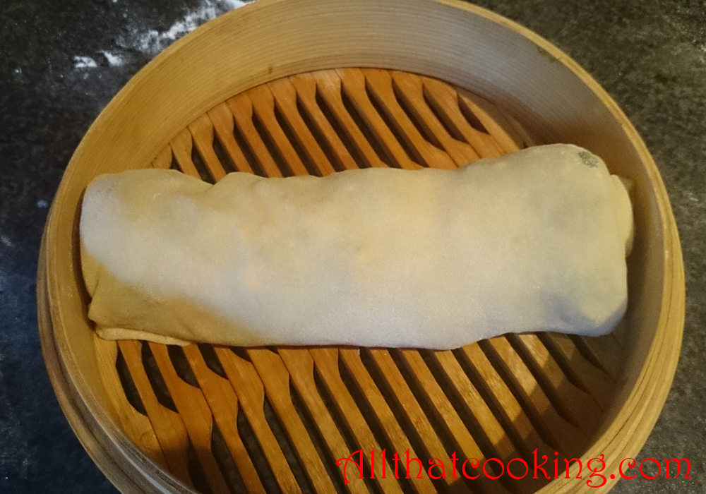6. Carefully settle the roll into the basket and cover with steamer lid.