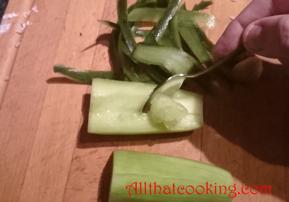 1. Peel cucumber and cut in half lengthwise. Use a spoon to scoop out the seeds. Just start at one end and drag the spoon to the other end of the cucumber – seedless in no time.