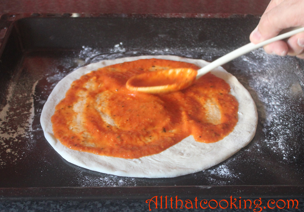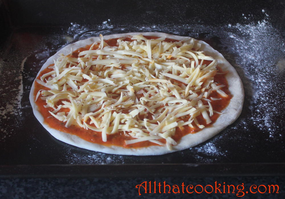 2.  After you have streched the dough place it on a lightly floured baking tray.  Spoon sauce evenly over the surface but stay away from the edge.  Top with cheese. a b 3. Bake in preheated oven 8-10 minutes, or until dough and cheese are golden.