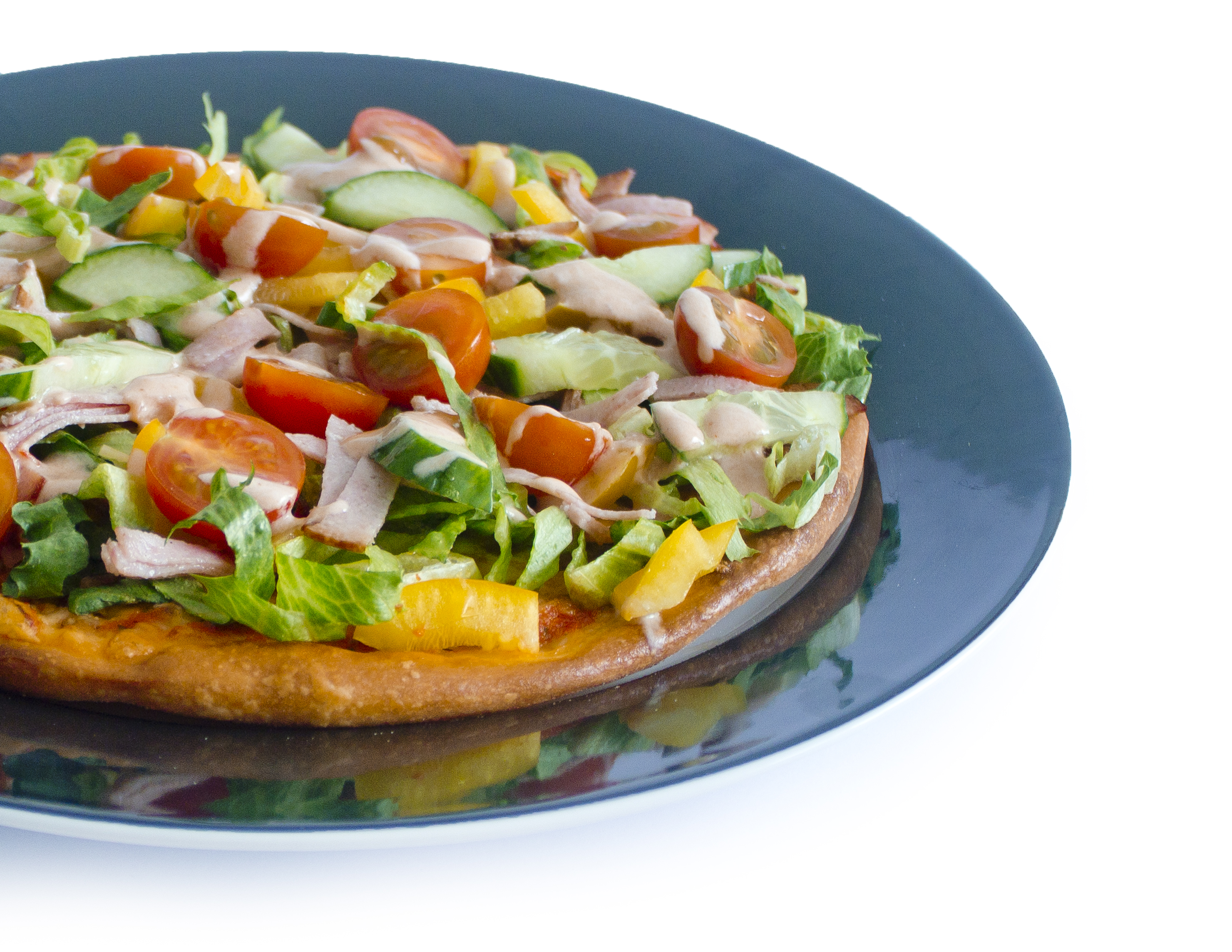 When the pizza is out of the oven top it with your salad, give the yogurt chili sauce a stir and drizzle it on top.