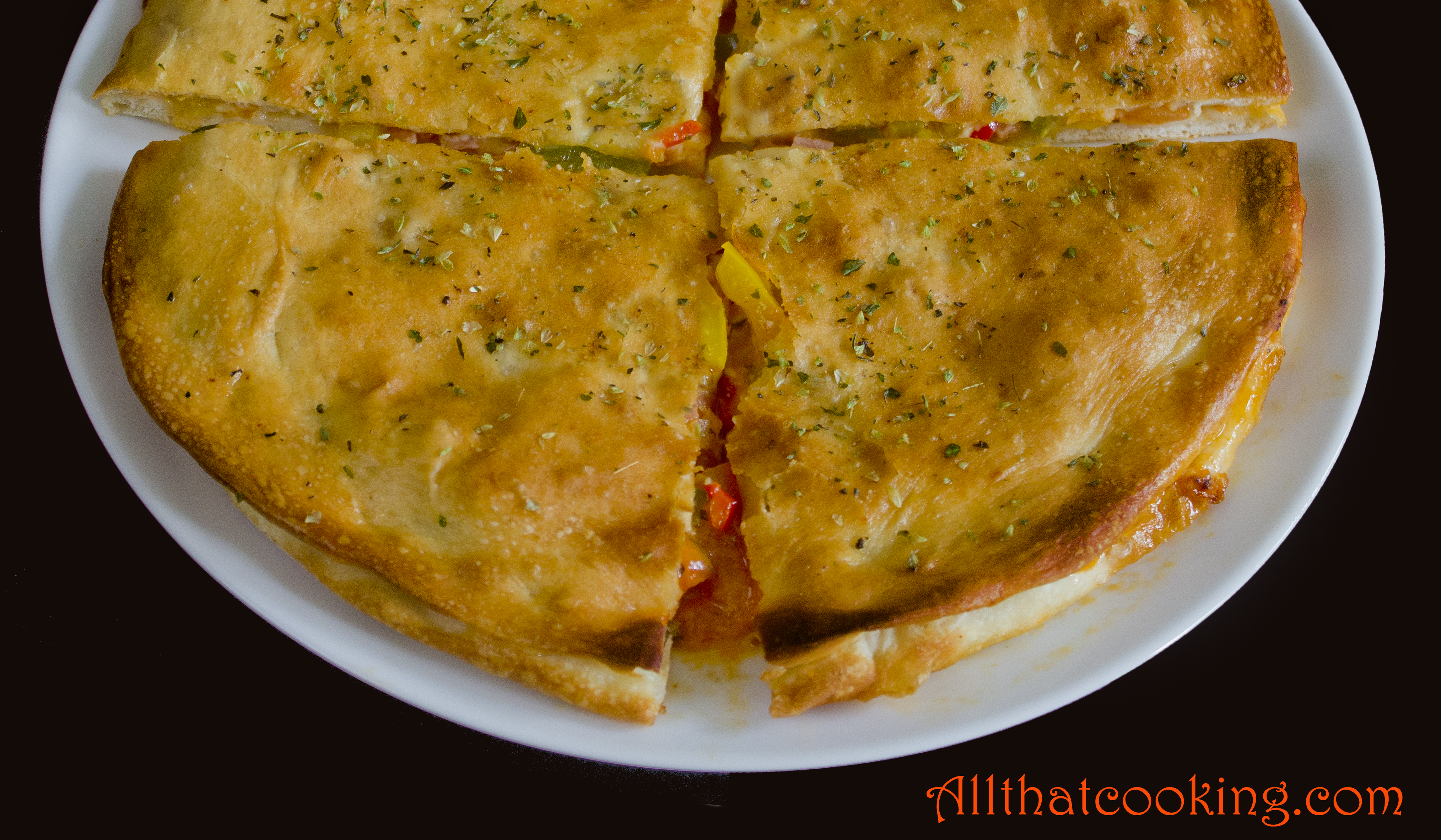 Getting back to Oli’s pie, he used his own favorites for the filling: pizza sauce, cheese, ham, bell peppers and of course a chili pepper.