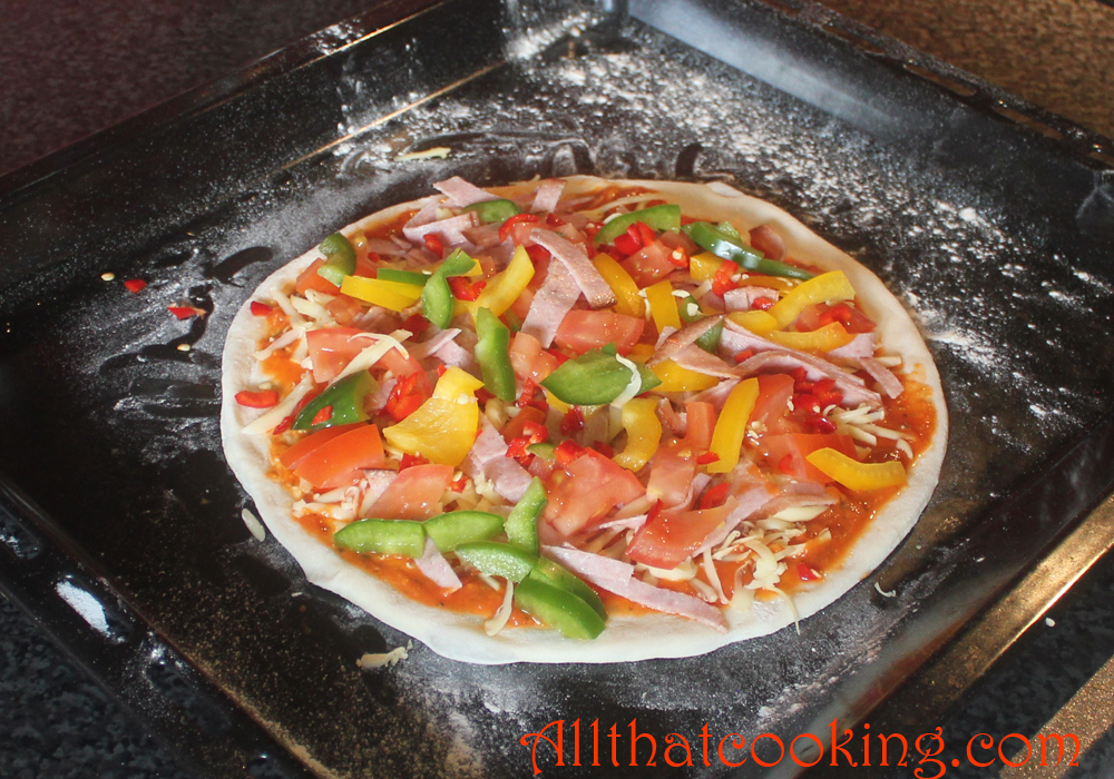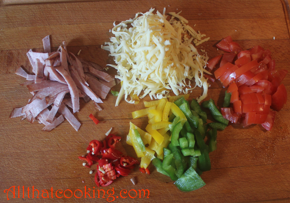 (Oli used ham, tomatoes, green and yellow bell peppers and one chili.  If you use a chili, finely chop it.)