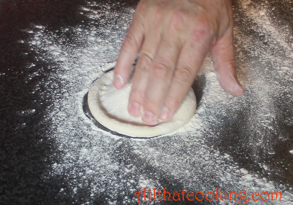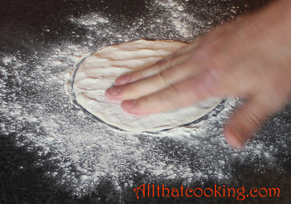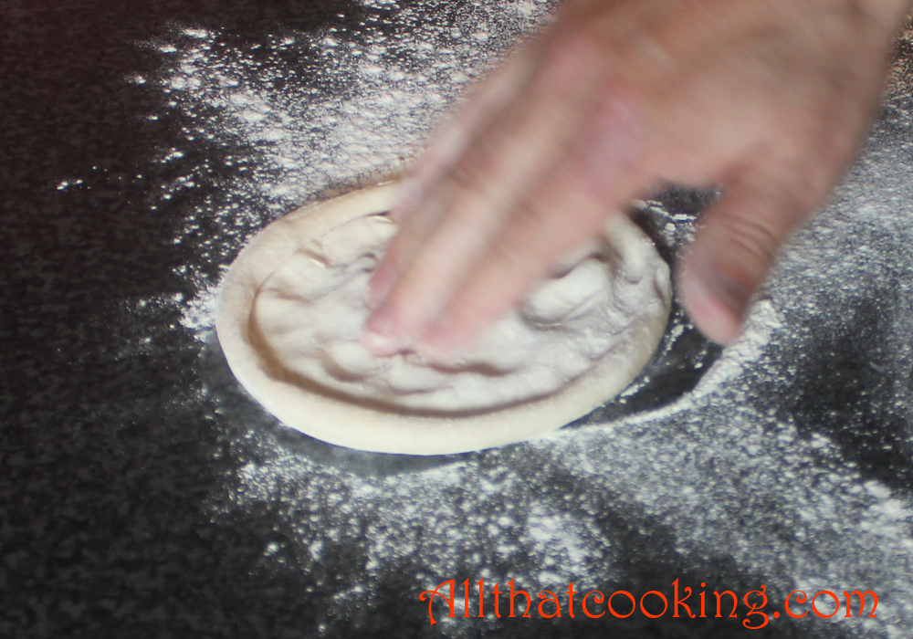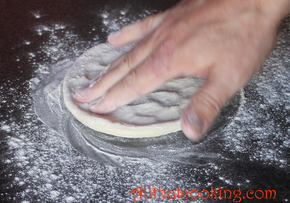 3.   Now press the middle to even it out and start stretching the dough  with your fingers, stay  inside the built up edge that you made.