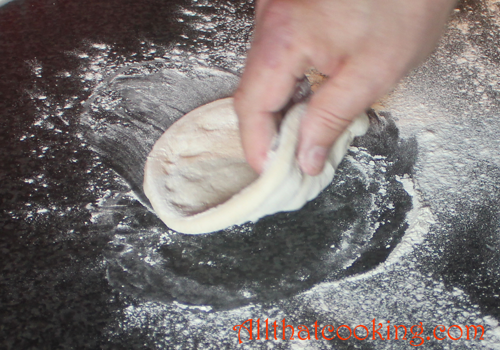 4.   Turn the dough over and do exactly the same thing.  (Make sides and stretch the dough.)  This time carefully stretch the dough to about a 11-inch round.  Dust off as much of the flour that you can and place it on a lightly floured baking tray.