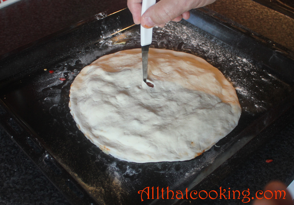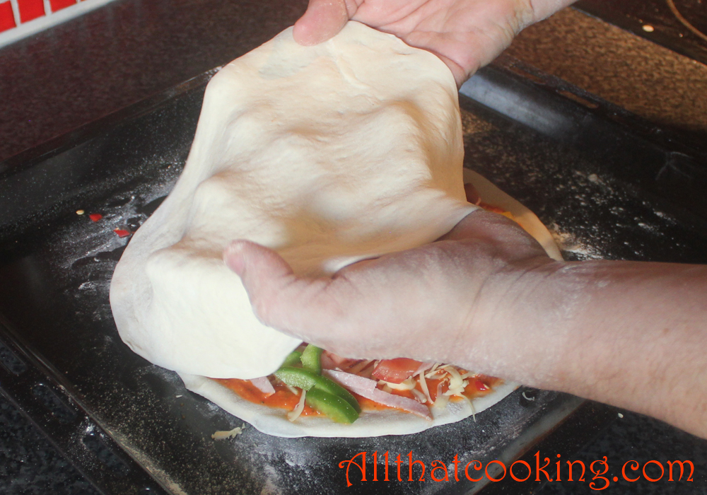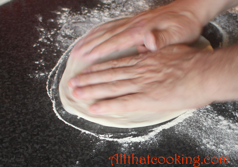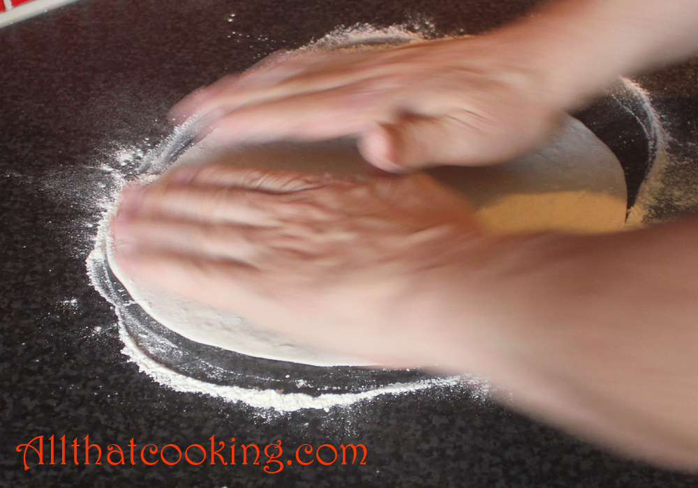2.  Make about 1/4 inch borders by pressing the dough with your fingers all the way around. This will give you higher sides and no risk the sauce and the cheese will slip out while baking and also gives you crunchy crust on the sides.