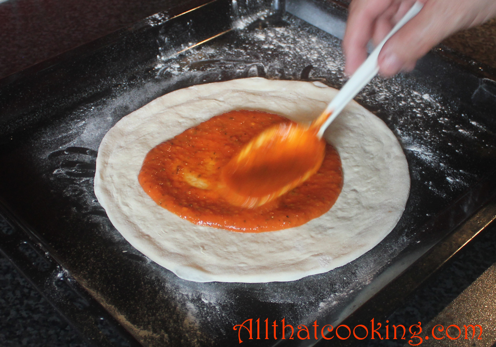 5.   Spread pizza sauce evenly over the surface keeping away from the sides.  Top with cheese and then the other toppings you are using.