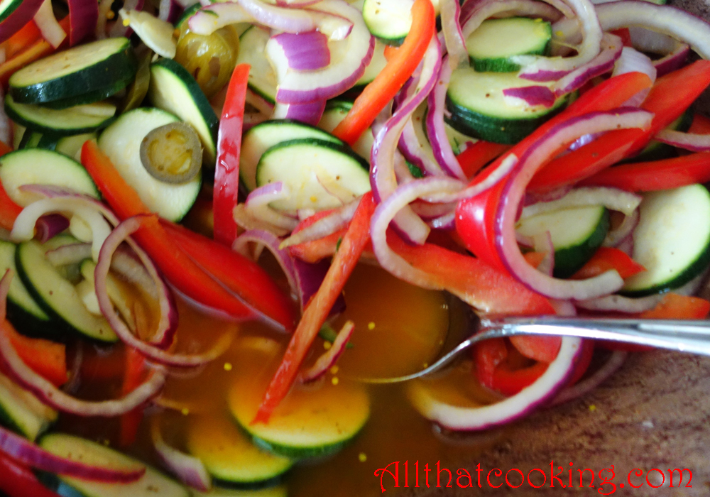 I love this recipe for its simplicity and especially for its room for flexibility. I tossed in a red bell pepper but you can easily substitute carrot slices. If you’ve got zucchini’s cousin, yellow squash, go ahead and mix it in as well. I made this batch with white wine vinegar, but plain ole vinegar will do quite nicely. Instead of a jalapeño, sprinkle in some red pepper flakes. I made use of what was left of my jar of jalapeños instead of using a fresh one this time. Well, I did say I love the flexibility of this recipe.