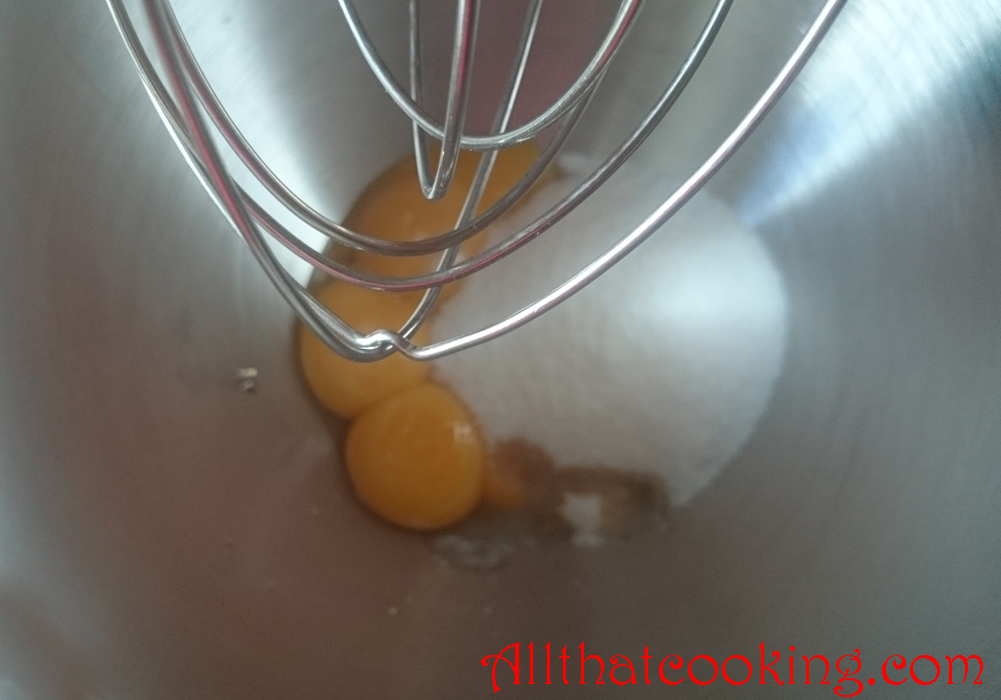 1. Slide the yolks into the bowl of a stand mixer fitted with a whisk. Dump in sugar and vanilla. Whisk at medium high speed for a few minutes until thick and light in color. Pour egg mixture back into bowl that held the yolks.